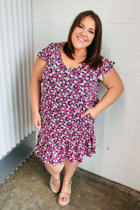 Black Multicolor Floral Babydoll Flutter Sleeve Midi Dress